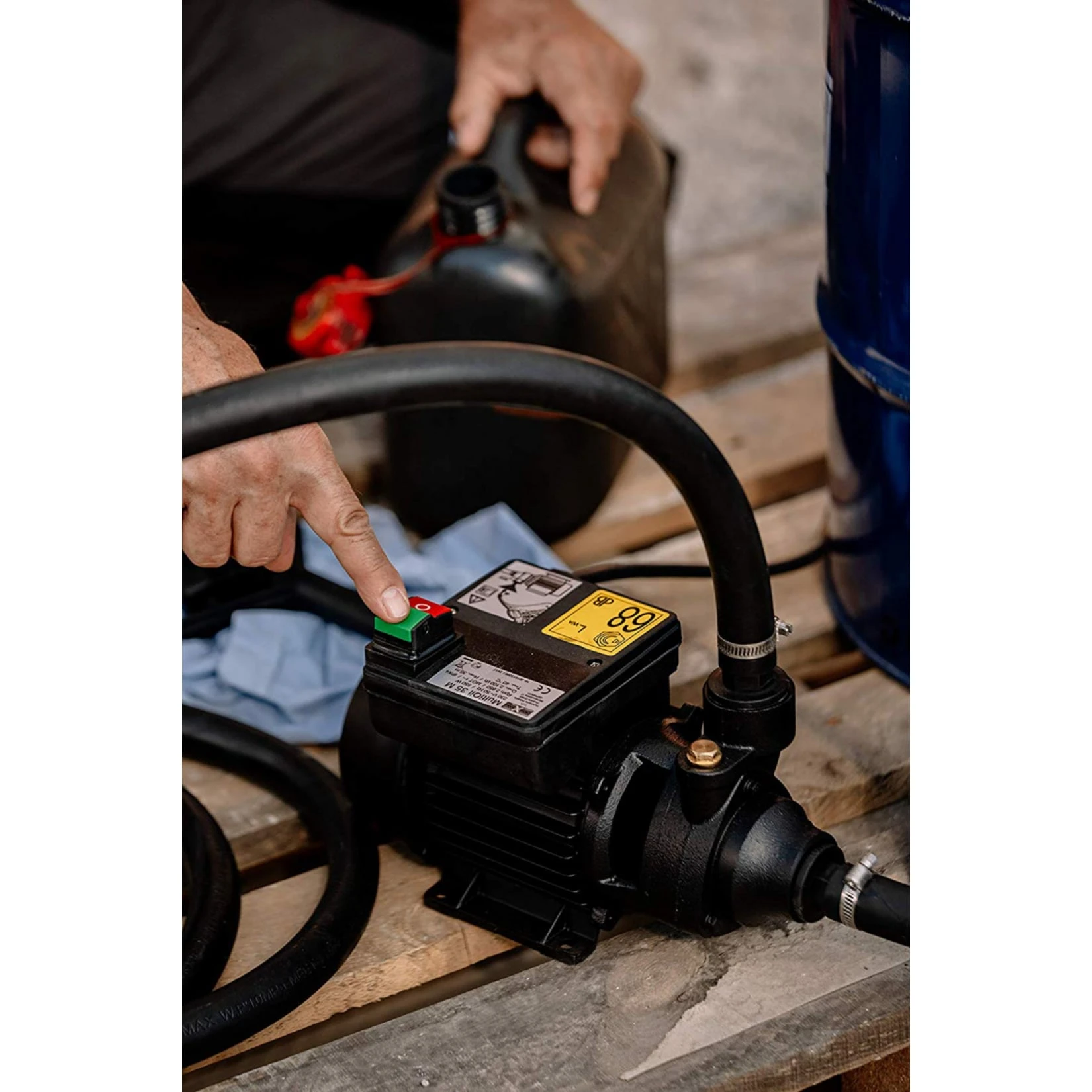 Ausgestattet ist die Pumpe mit einer Zapfpistole, Messing-Fußventil sowie einem hochwertigen Ansaug- und Zapfschlauch.
