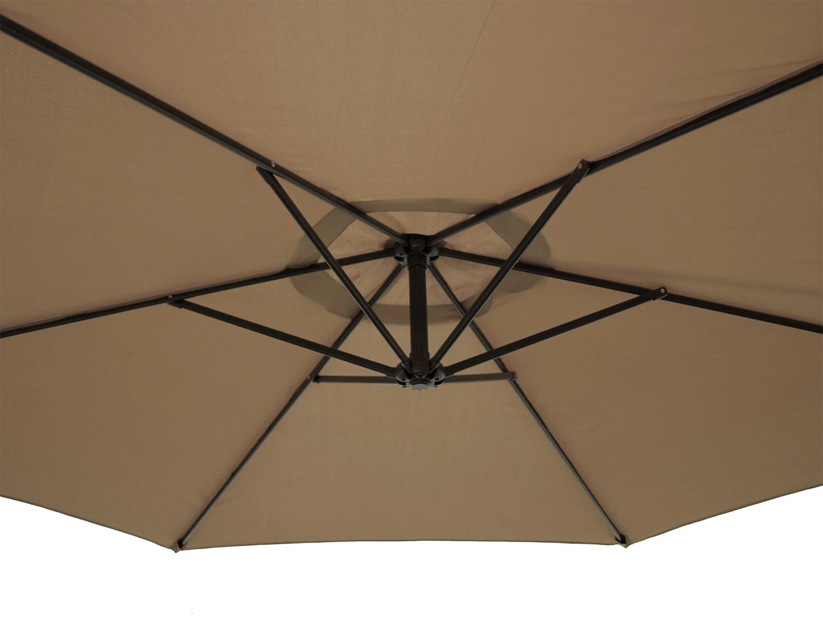 Hochwertiger Ampelschirm im Farbton taupe, Durchmesser 300cm. Das widerstandsfähige Gestell ist aus Aluminium gefertigt und somit rostfrei (Unterteil, Ständer + Streben teilw.: Stahl). Das Gestell ist passend zu der Bespannung in anthrazit gehalten.