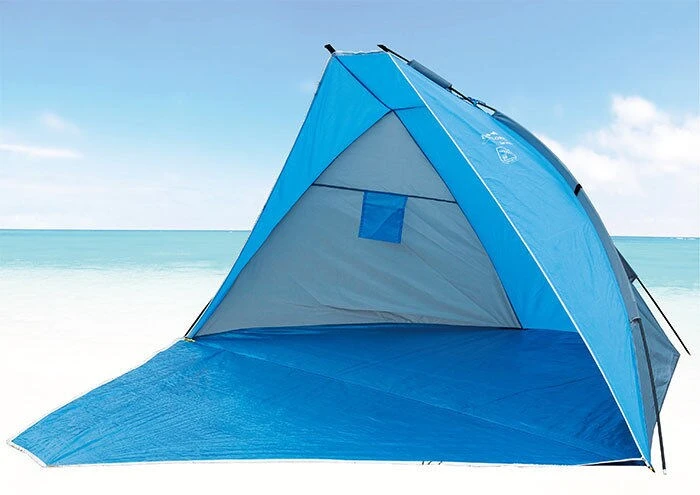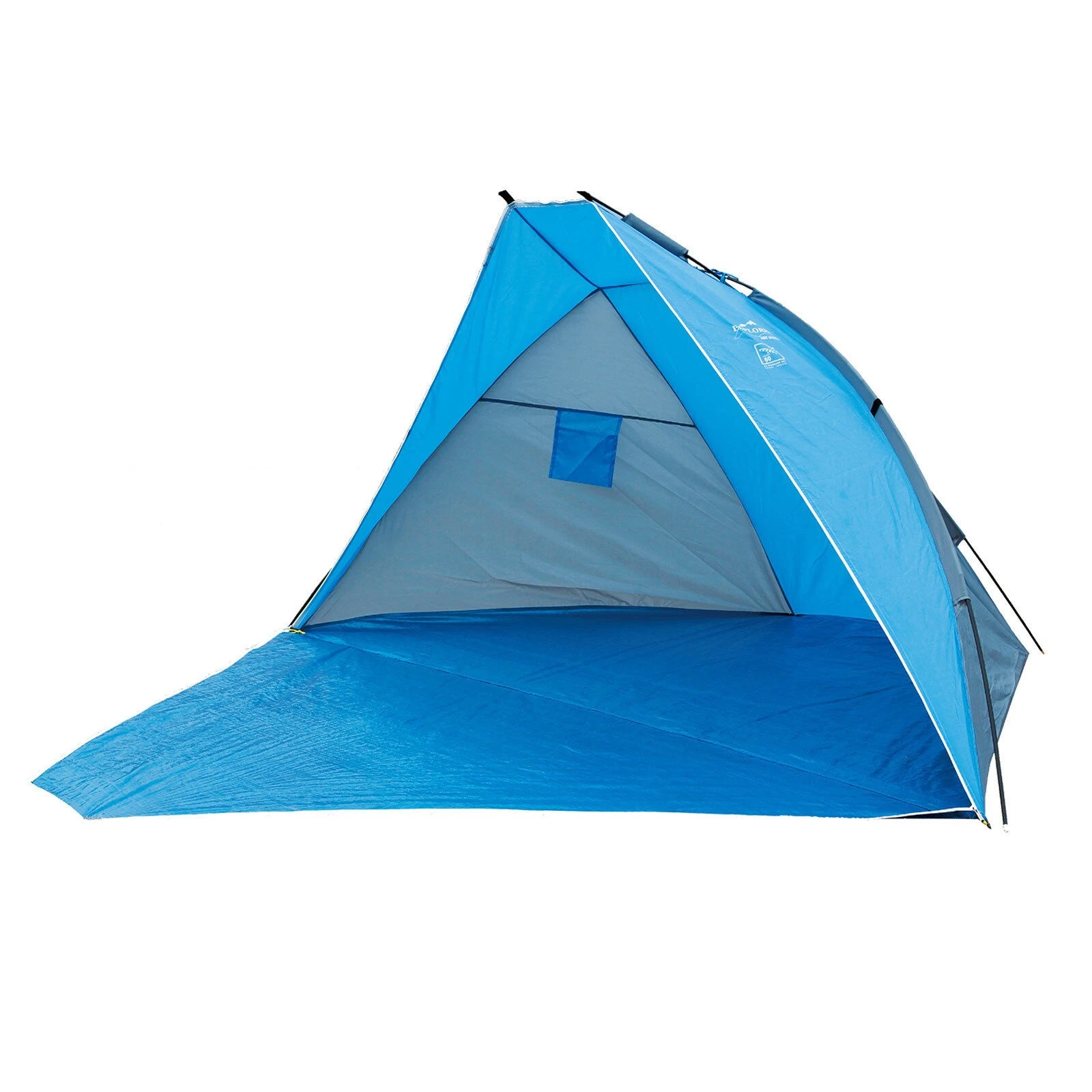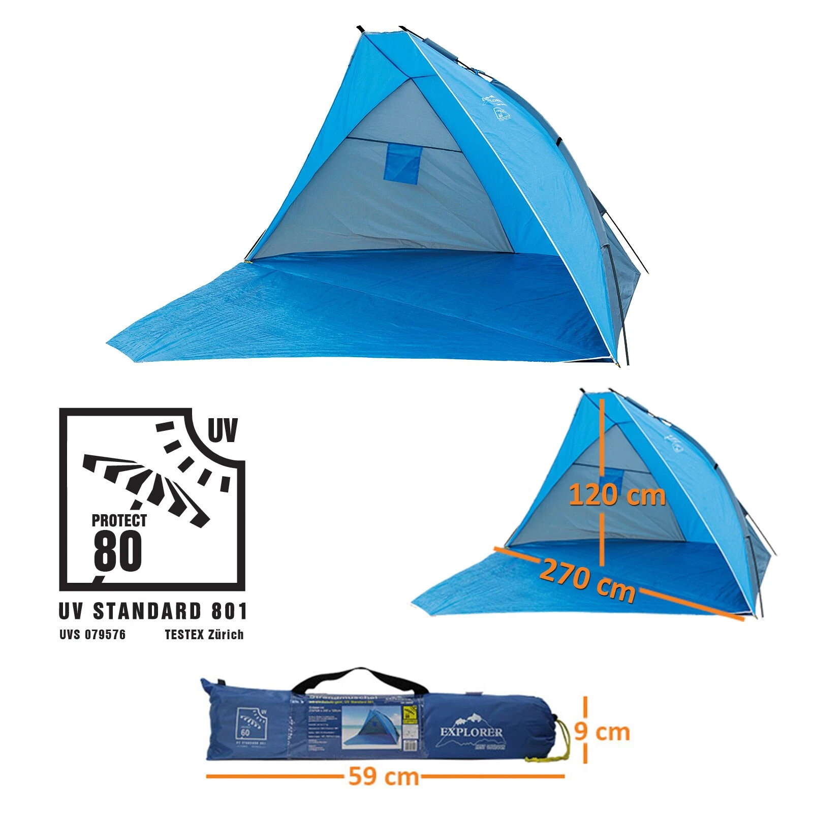 Diese verschließbare Strandmuschel von Explorer dient Ihnen nicht nur als Wind- und Sonnenschutz, sondern dank einer 400 mm PU-Beschichtung auch als Zuflucht vor leichtem Regen. Die Vorderwand bietet ausgeklappt eine große Liegefläche und geschlossen einen optimalen Schutz vor Wettereinflüssen. In einer Innentasche können Strandutensilien untergebracht werden.