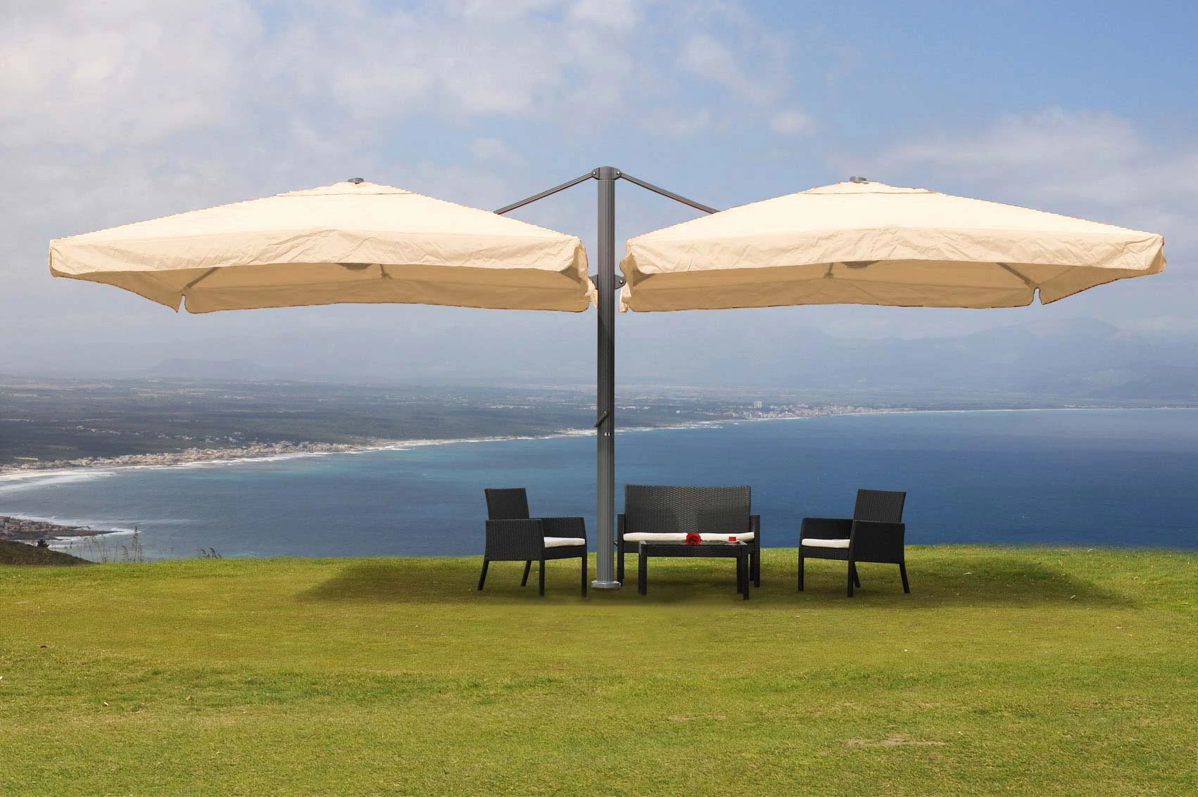 Doppelt hält besser – natürlich ist dieser gigantische Zwillingsschirm, mit seinem Gestänge aus pulverbeschichtetem, rostfreien Aluminium, für dauerhafte Aufgaben (bspw. als Pergola oder Gartenlaube) geradezu prädestiniert, andererseits macht ihn der separat oder im Set erhältliche Schirmständer, dank Rollen und abnehmbarer Deichsel, tatsächlich mobil. Man möchte beinahe über die Mitnahme bei der nächsten Wanderung nachdenken. Spaß beiseite, doch die ungeahnte Flexibilität, in Kombination mit bombenfestem Stand, macht unsere Schirmständer zum Must-Have – nicht nur für gewerbliche Nutzer.