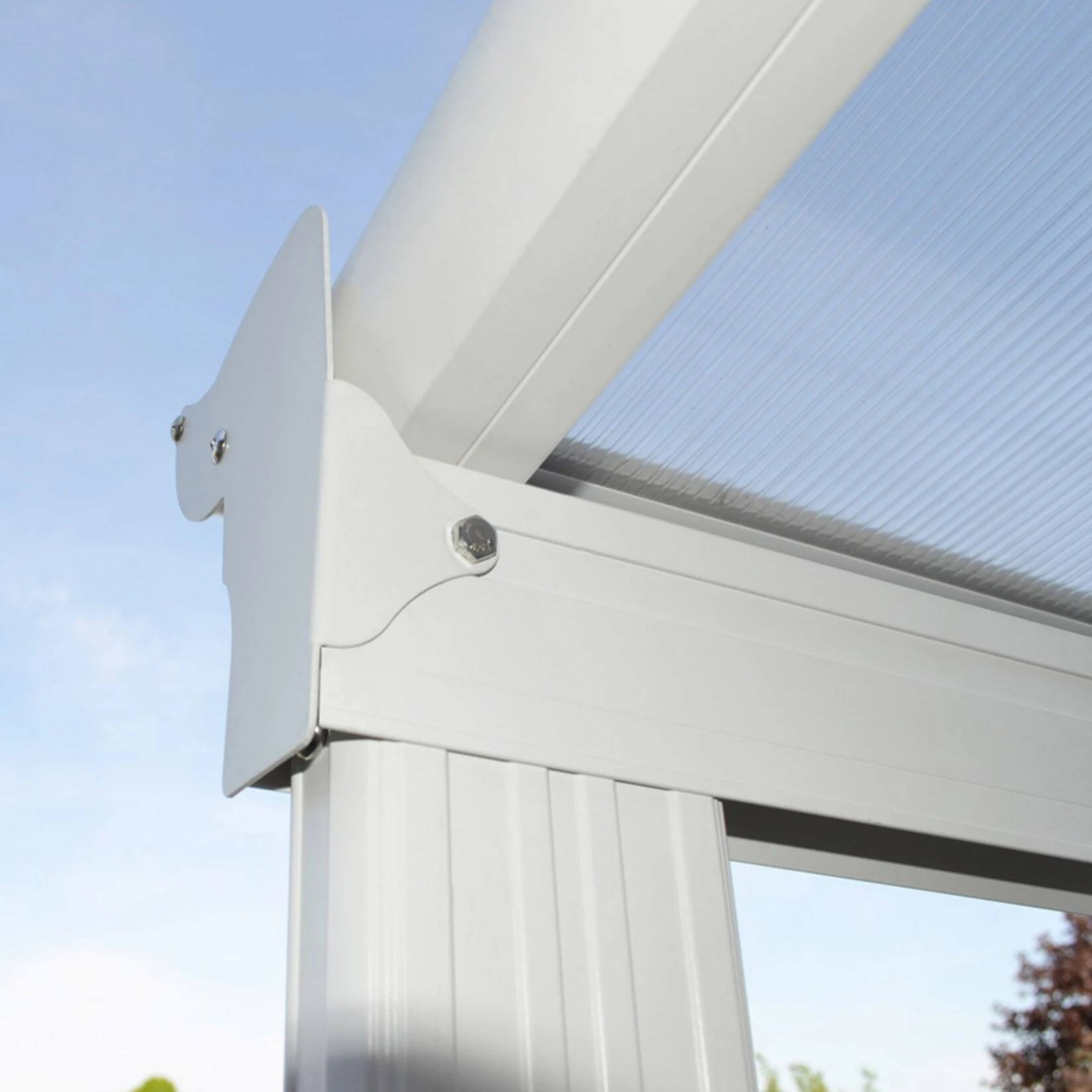 Wir haben bewusst fünf verschiedene Breitenmaße im Angebot, damit fast jeder gewünschte Anbauort flächenmäßig möglich ist. Das gesamte Terrassendach ist als Bausatz konstruiert. Dieser beinhaltet alle benötigten Teile: Sichtschienen aus Aluminium (nichtrostend, leicht und sehr stabil). Hinzu kommen Verbindungsplatten, Winkel, U-Schienen, Schrauben, Dübel, Bolzen, Kappen, Regenablauf und doppelwandige Hohlkammerplatten.