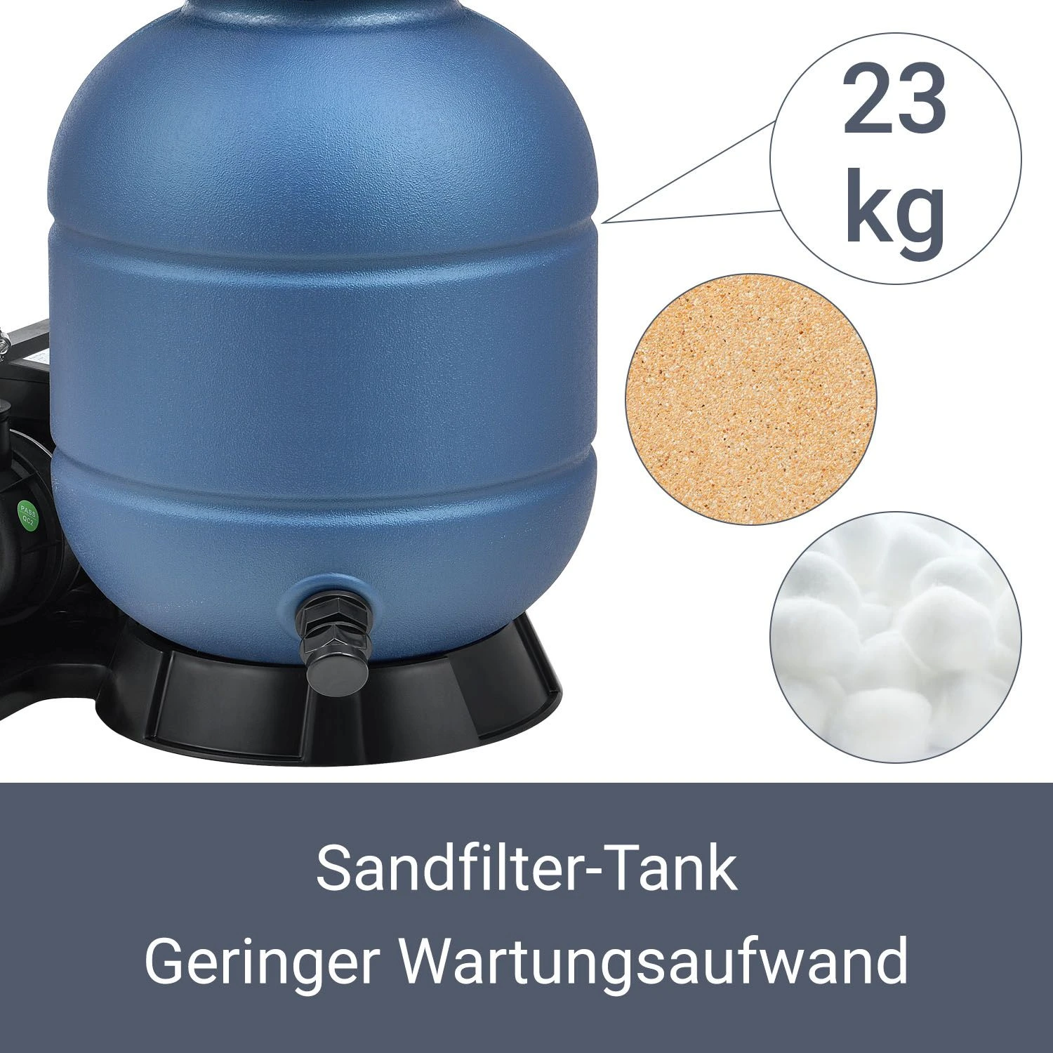 - Filtermaterial/Volumen: max. 23 kg Sand (auch Filterbälle als Filtermaterial verwendbar)