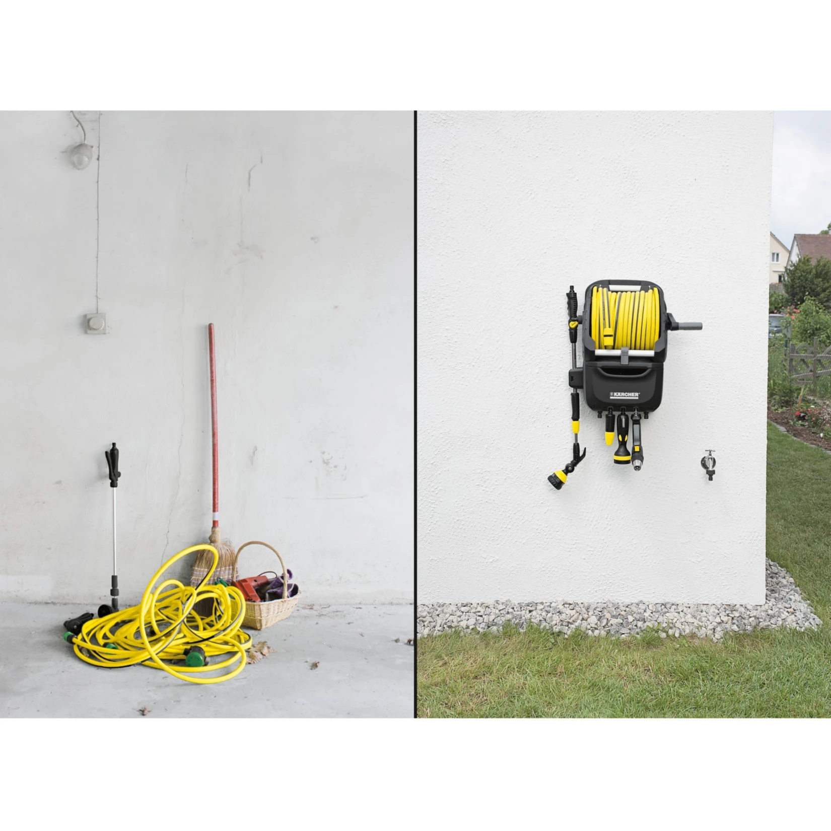 Der Premium Schlauchträger HR 7.315 Kit 1/2″ von Kärcher ist eine kompakte Bewässerungsstation, tragbare Schlauchtrommel und Schlauch-Wandhalterung in einem. Er eignet sich für den mobilen oder stationären Einsatz, perfekt zur Bewässerung kleiner bis mittelgroßer Flächen und Gärten. Er spart Platz und bietet eine Aufhängemöglichkeit für Spritzen und Brausen. Außerdem verfügt er über eine aufklappbare Verstaubox für Gartenscheren, Handschuhe und andere Gartenwerkzeuge. Der flexible Schlauch PrimoFlex ist dreilagig und mit einer druckfesten gewebten Armierung versehen. Durch die hohe Temperaturbeständigkeit von -20 bis +65 °C ist dieser Gartenschlauch bei jeder Wetterlage einsatzbereit. Er ist kadmium-, barium-, blei-, sowie pththalatfrei und so besonders umweltfreundlich und gesundheitlich unbedenklich. Die lichtundurchlässige Zwischenschicht verhindert Algenbildung im Schlauch und die Anti-UV-Außenschicht ermöglicht Robustheit und Langlebigkeit.