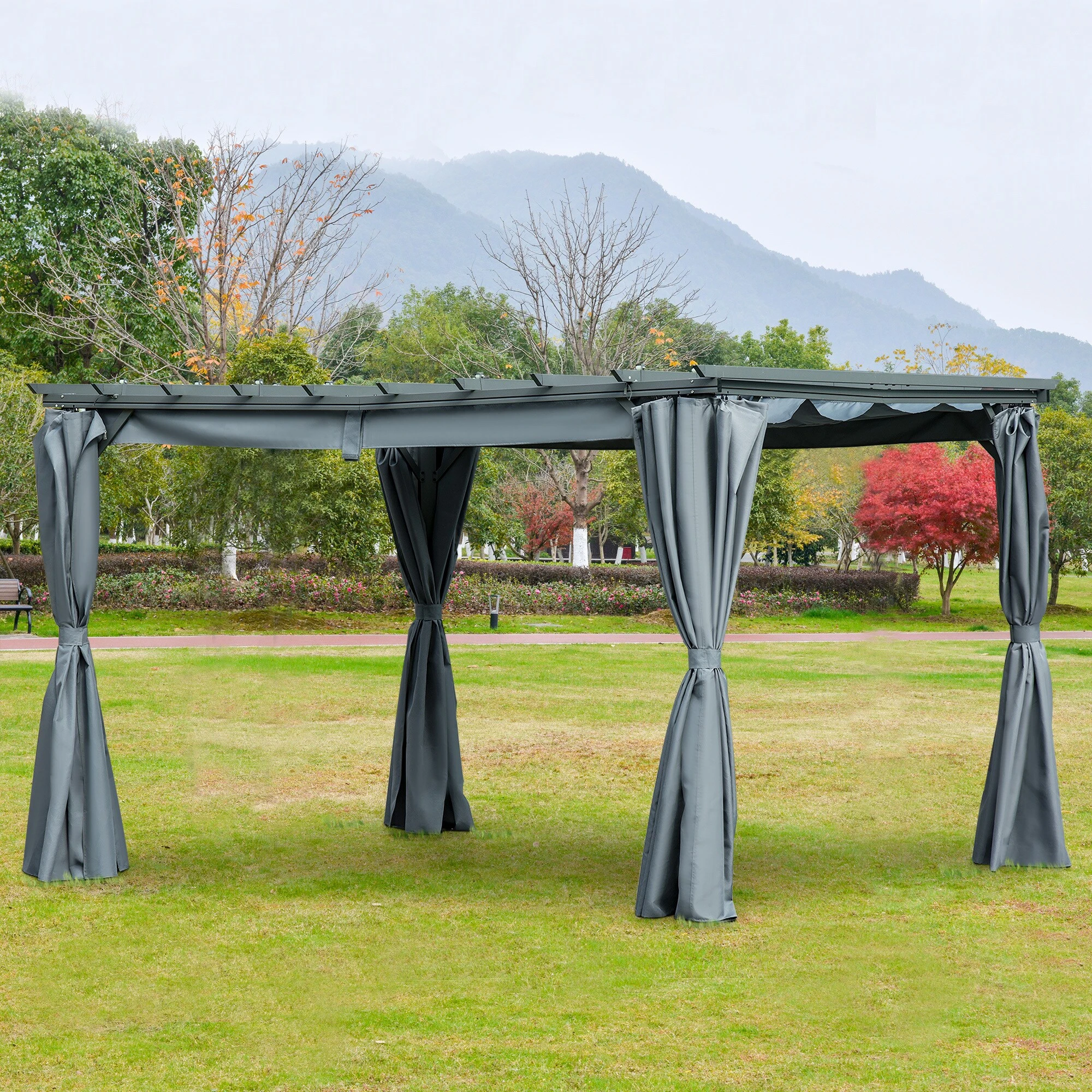 Bringen Sie Stil und Atmosphäre mit dieser einzigartigen und praktischen Überdachung von Outsunny nach Hause! Es bietet viel Platz, um darunter bequem einen kompletten Ess- oder Sitzbereich einzurichten, hat ein große Flexibilität, Stil und Funktion. Die Säulen aus Vollaluminium sorgen für einen stabilen Halt. Das klappbare Vordach und die praktischen Vorhänge bieten Sonnenschutz und Privatsphäre. Eine tolle Ergänzung, um Ihr Leben interessanter zu gestalten!