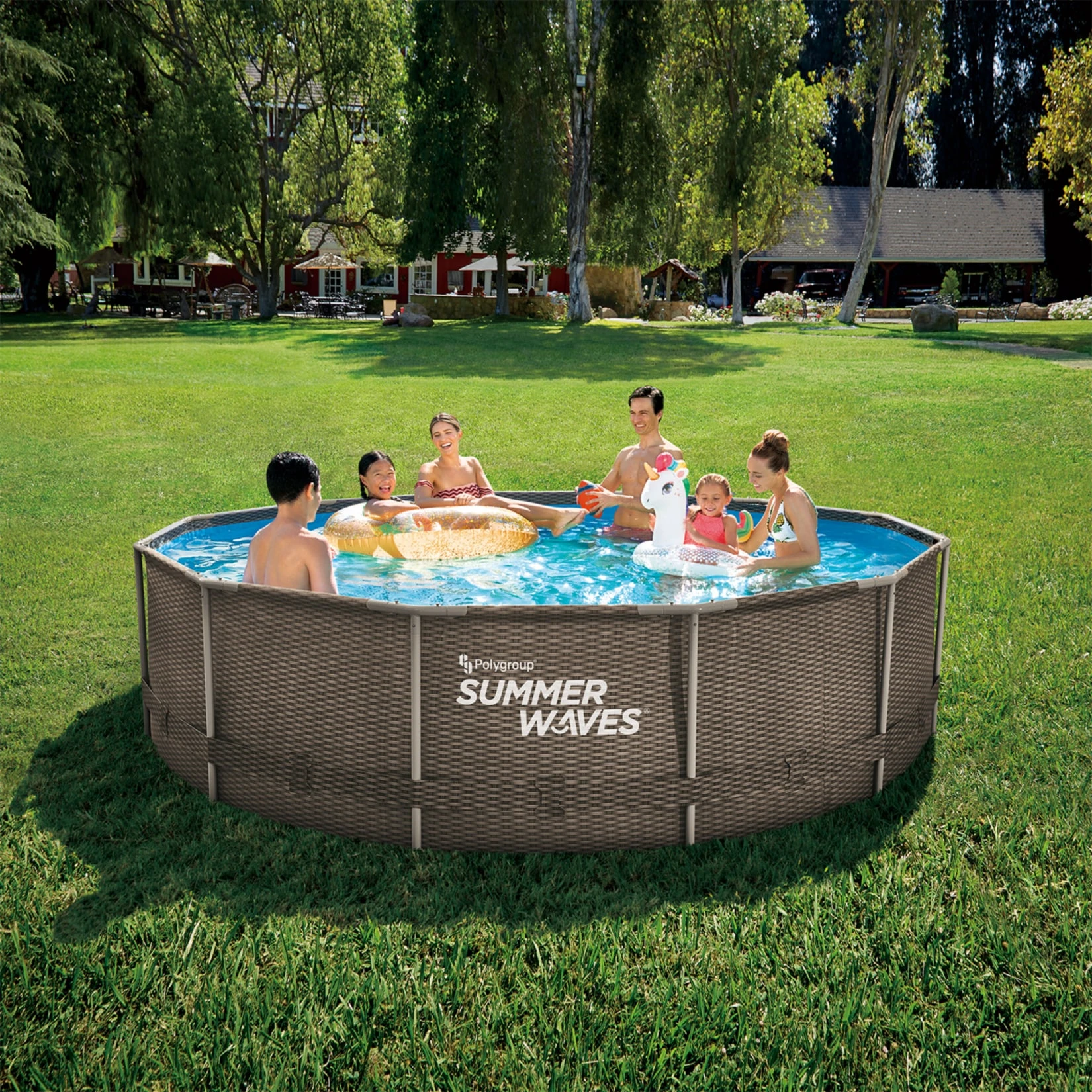 Dieser Summer Waves Pool ist ein oberirdischer, runder Rahmen-Pool in modernem Rattan braun. Durch die Rattan-Optik fügt sich der Rahmen-Pool elegant und stilvoll in sein Umfeld und jede Gartenlandschaft ein, ohne aufdringlich zu wirken.