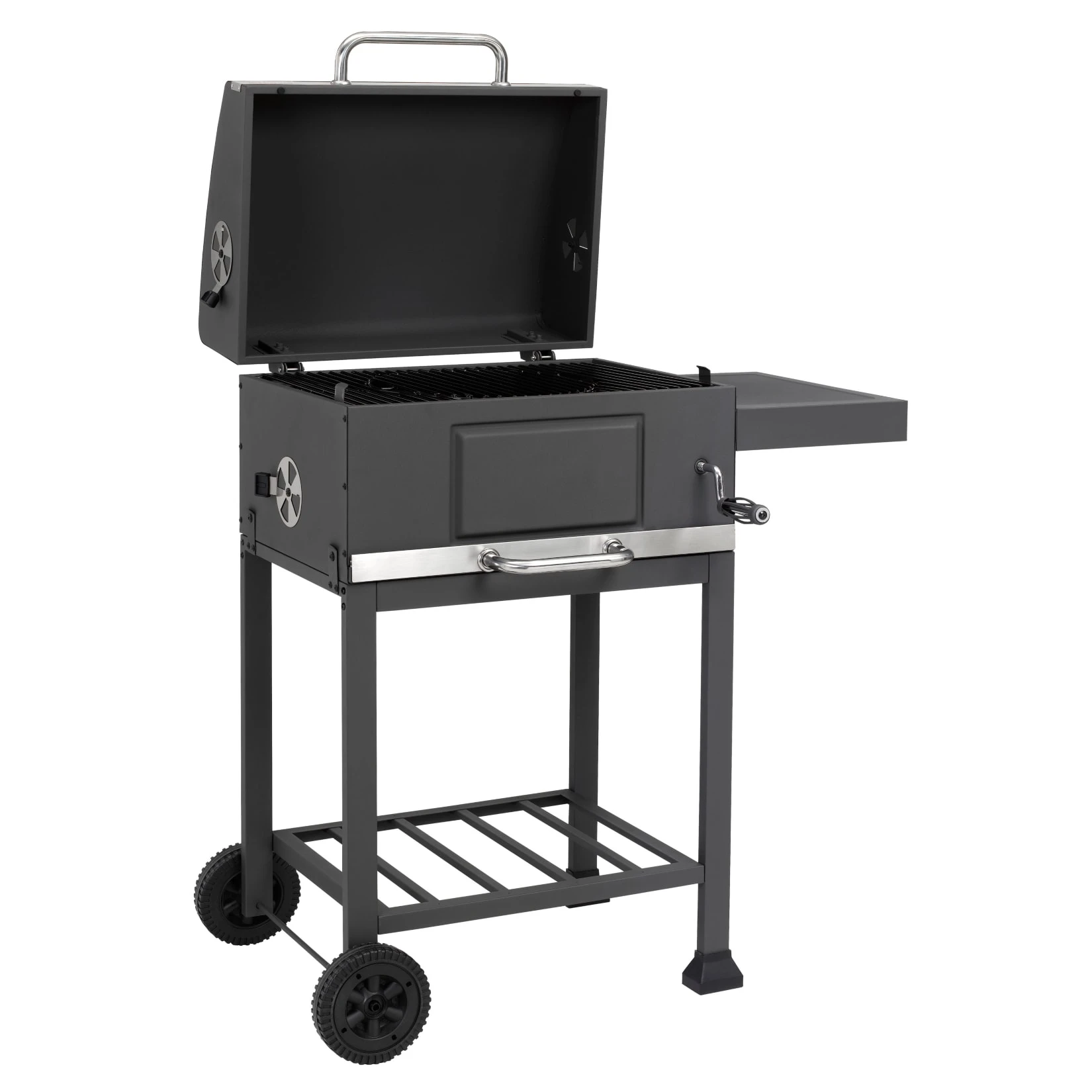- emaillierte Holzkohlenwanne, mittels Kurbel höhenverstellbar